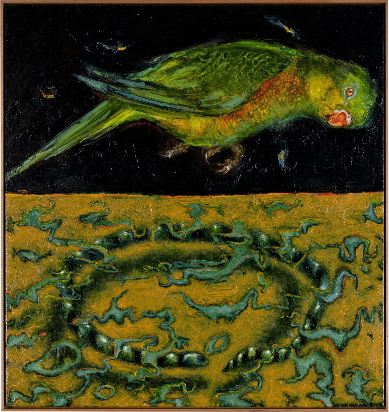 Peter Hudson is as interested in the social and cultural history of the places he paints, as the natural landforms. He sees place inextricably woven with it’s myths, ‘legends and psyche of it’s inhabitants’. He is very drawn to the mystery of the night sky. He says ‘to look to the heavens at night helps me understand the mind blowing scale of the universe, a reminder of the surreal reality of this beautiful green planet’. His works Bird and Sea Snake and Feathers and Scales, play with the strange similitude of the sea and the sky and it’s ‘surreal reality’. And like Sidney Nolan in his bird paintings from the later 1940s, Hudson looks for the strange links between things. The parrots in Hudson’s paintings appear as if they have arrived incomprehensibly from a dream.