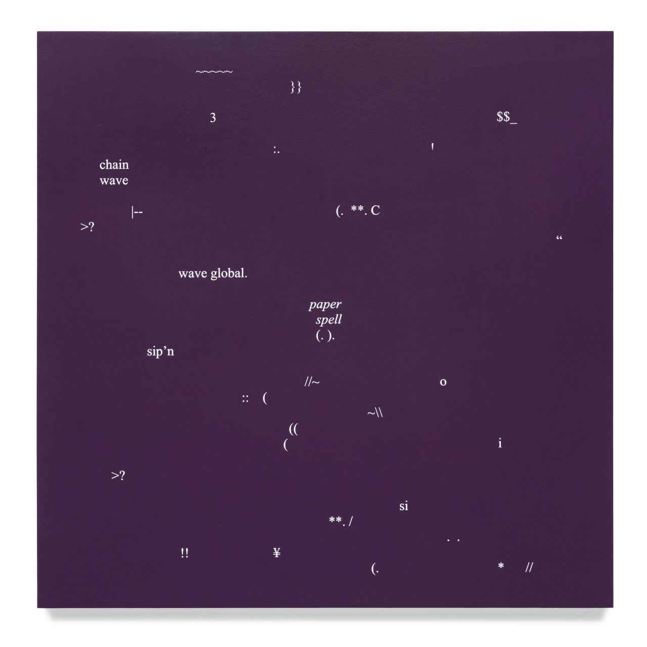 Sebastian Moody (b.1979) lives and works in Brisbane where he completed a Bachelor of Visual Arts at QUT, and a Master of Museum Studies at the University of Queensland. Moody’s witticisms are well know across Brisbane’s city built-environment like: “the more I think about it the bigger it gets”, and “keep the sunshine”. Moody is interested in not only words but the look of them and where the viewer encounters them, or, as he says, ‘words in their presentation and aesthetic’. He is interested in the slide of meaning, particularly in open ended utterances. He says it’s ‘the moments’, he wants to create ‘not things’. Moody’s painting Opinion Fatigue (chain wave paper spell) feels like what might happen to eliminate for one moment, the overdose of media opinion. We could be left with a sense of outer space, flicking with punctuation. It could be a welcome relief.