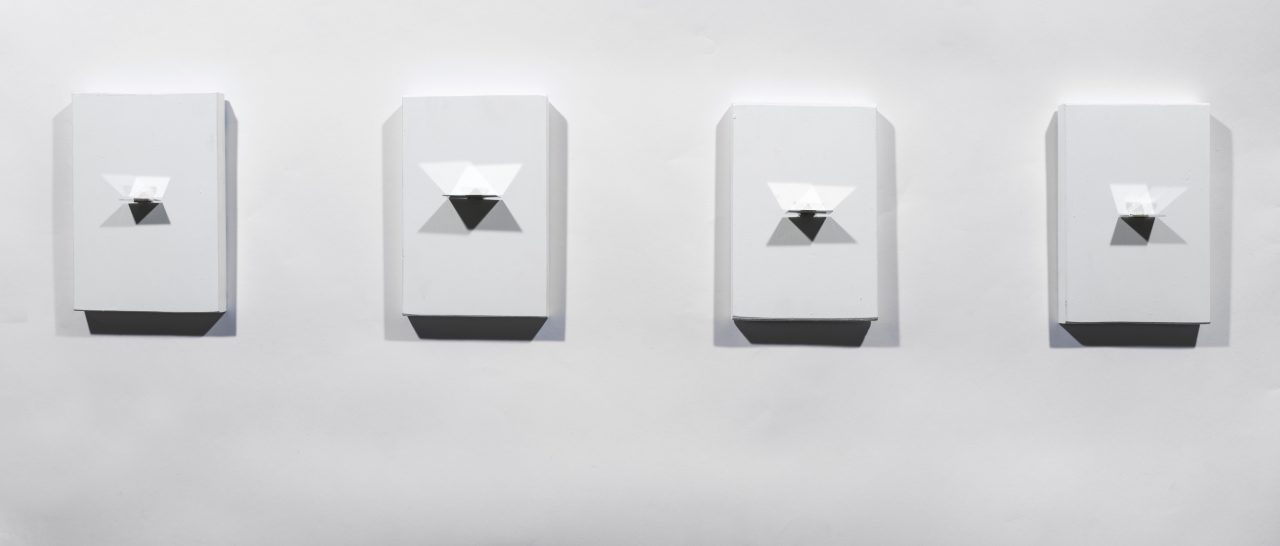 In Trace, Manning’s work Reflection Study is a work that has been pared right back. It has been said that Manning seems ‘to unlock a hidden beauty from ordinary objects’. And this is the case in Reflection Study. It consists of the simple play of reflected light from a horizontal mirror and the partial and overlapping shadows that ensue. It is a fully ambient work, entirely made by the changing light around it.